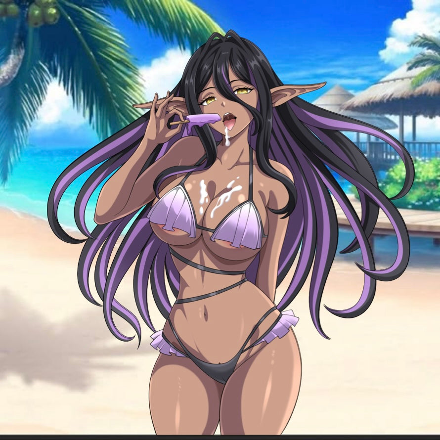 The dark elf beauty from Yandere Dark Elf: She Chased Me All the Way From Another World! has followed you straight to the beach — and she’s not letting you escape. In a lavender bikini that matches her flowing hair and sultry golden eyes, Airi enjoys her popsicle with a look that’s equal parts teasing and possessive.